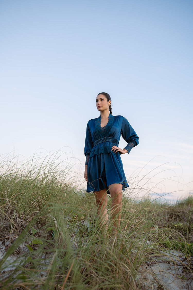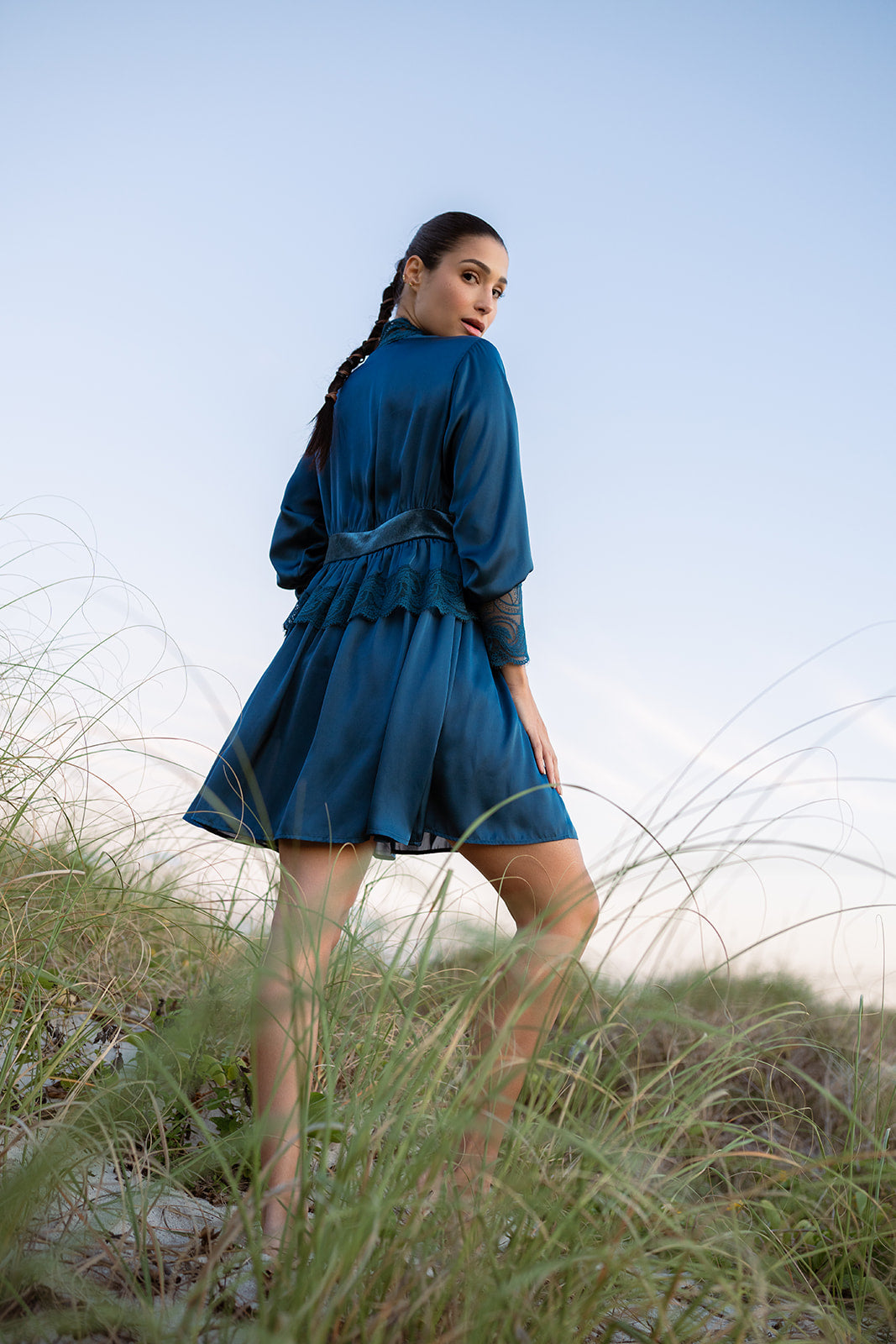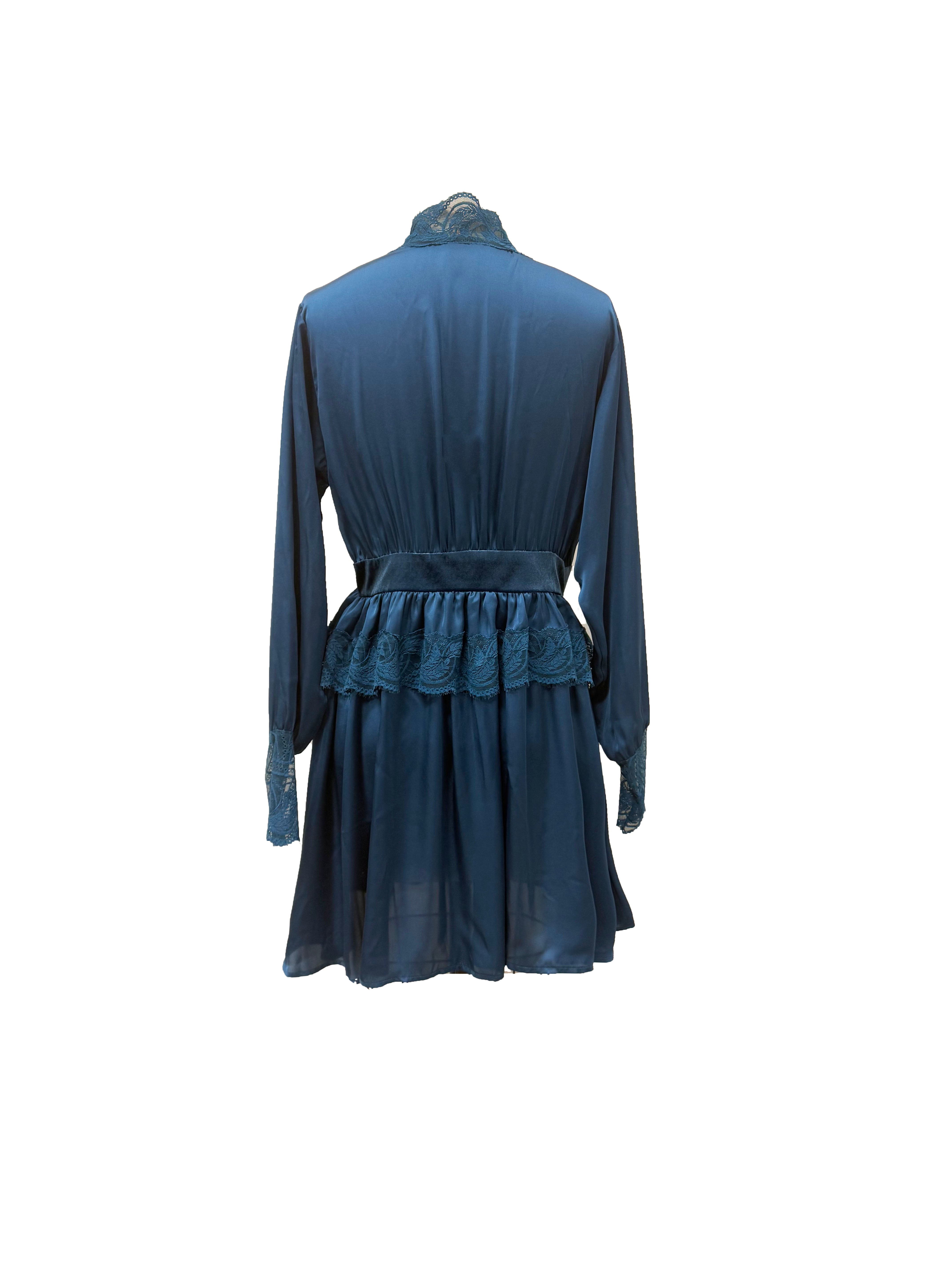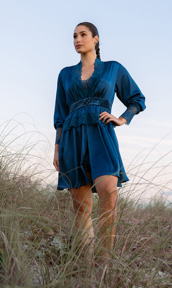 The Hydros Satin and Lace Bishop Sleeve Robe combines graceful design with soft materials. Crafted from smooth satin, it features delicate lace accents around the neckline and center front for an elegant touch. A plush velvet waistband with covered buttons enhances the silhouette while a peplum detail adds refined structure. The long bishop sleeves lend timeless sophistication, making this robe perfect for those seeking a blend of comfort and high-end style.