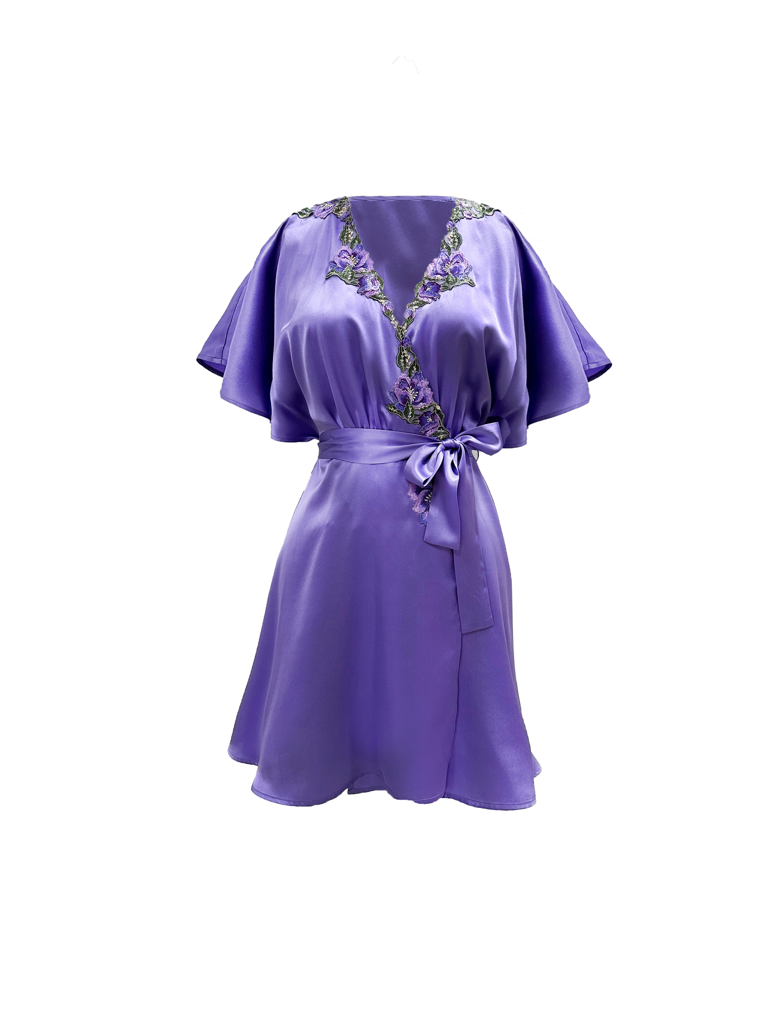 Expertly crafted from smooth and luxurious silk satin charmeuse, the Paradox Silk Embroidered Tulle Flutter Cover-Up is the pinnacle of sophistication. Its flutter sleeves and embroidered applique around the neckline add an elegant touch, while the silk sash belt ties the look together. Available in a stunning shade of lavender, this cover-up is the perfect addition to any wardrobe.