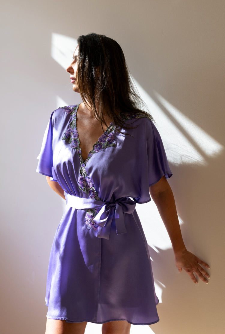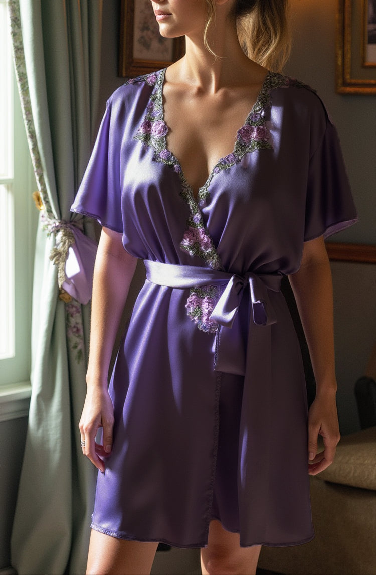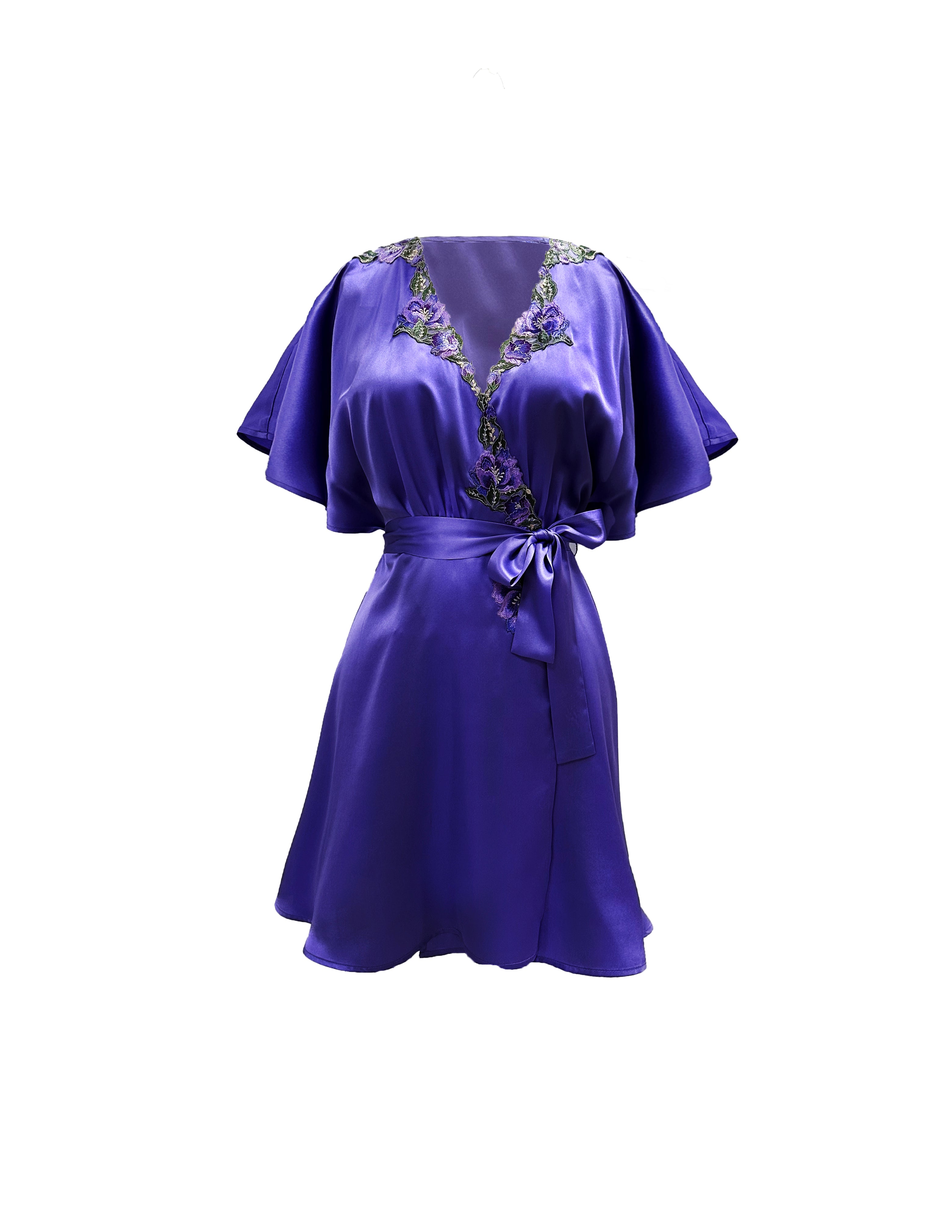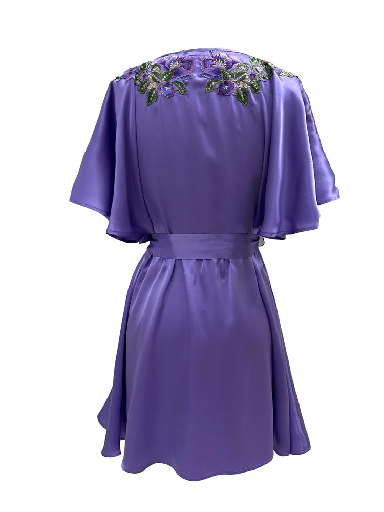 Expertly crafted from smooth and luxurious stretch satin blend, the Paradox Blend Dark Embroidered Tulle Flutter Cover-Up is the pinnacle of sophistication. Its flutter sleeves and embroidered applique around the neckline add an elegant touch, while the satin sash belt ties the look together. Available in a stunning shade of dark purple this cover-up is the perfect addition to any wardrobe.